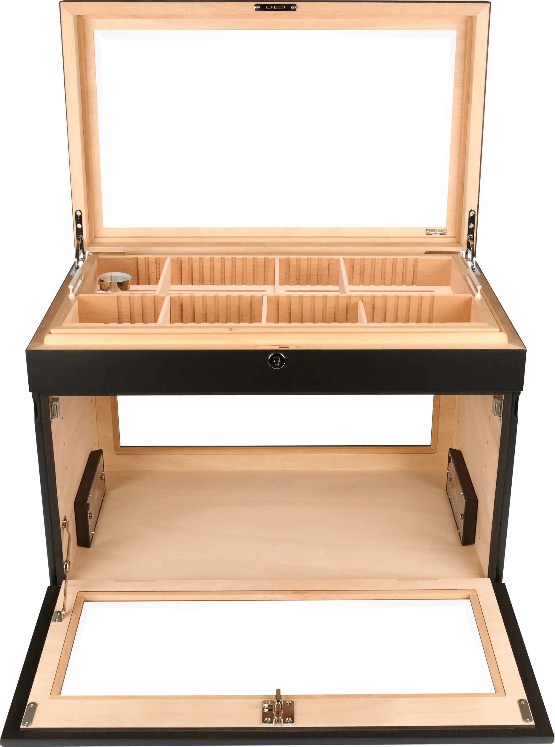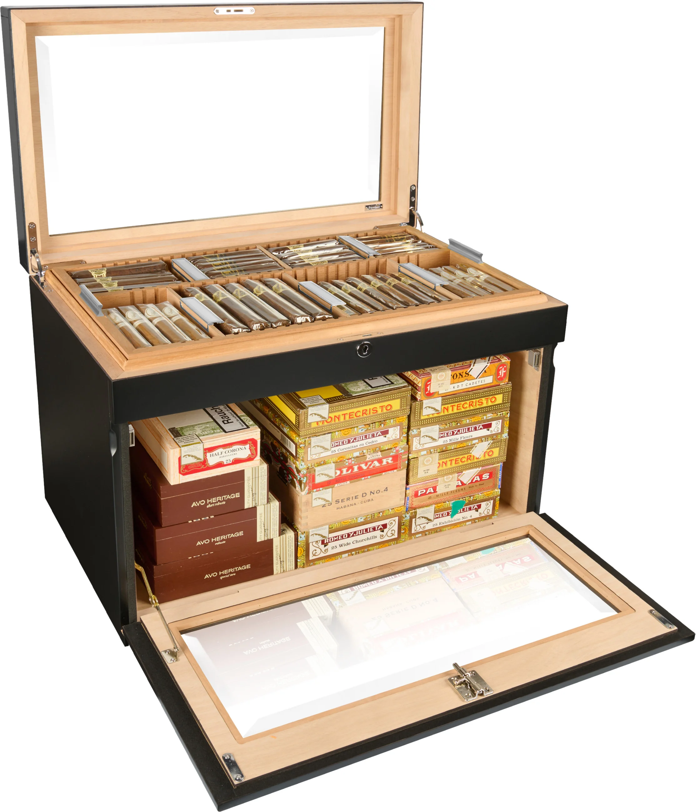 - Optional trays for individual cigars and boxes can be inserted and optionally angled for optimal presentation.