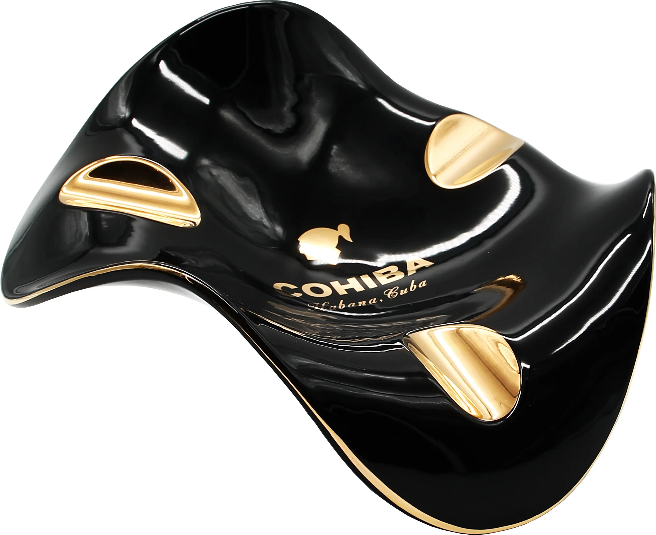 The Cohiba ashtray in black with gold accents is an exceptional accessory from the most renowned Cuban cigar brand, Cohiba. Its curved design lends it a special elegance, making it a true eye-catcher in any setting. Three generously sized cigar rests offer ample space for enjoying cigars in company and combine functionality with aesthetic appeal.