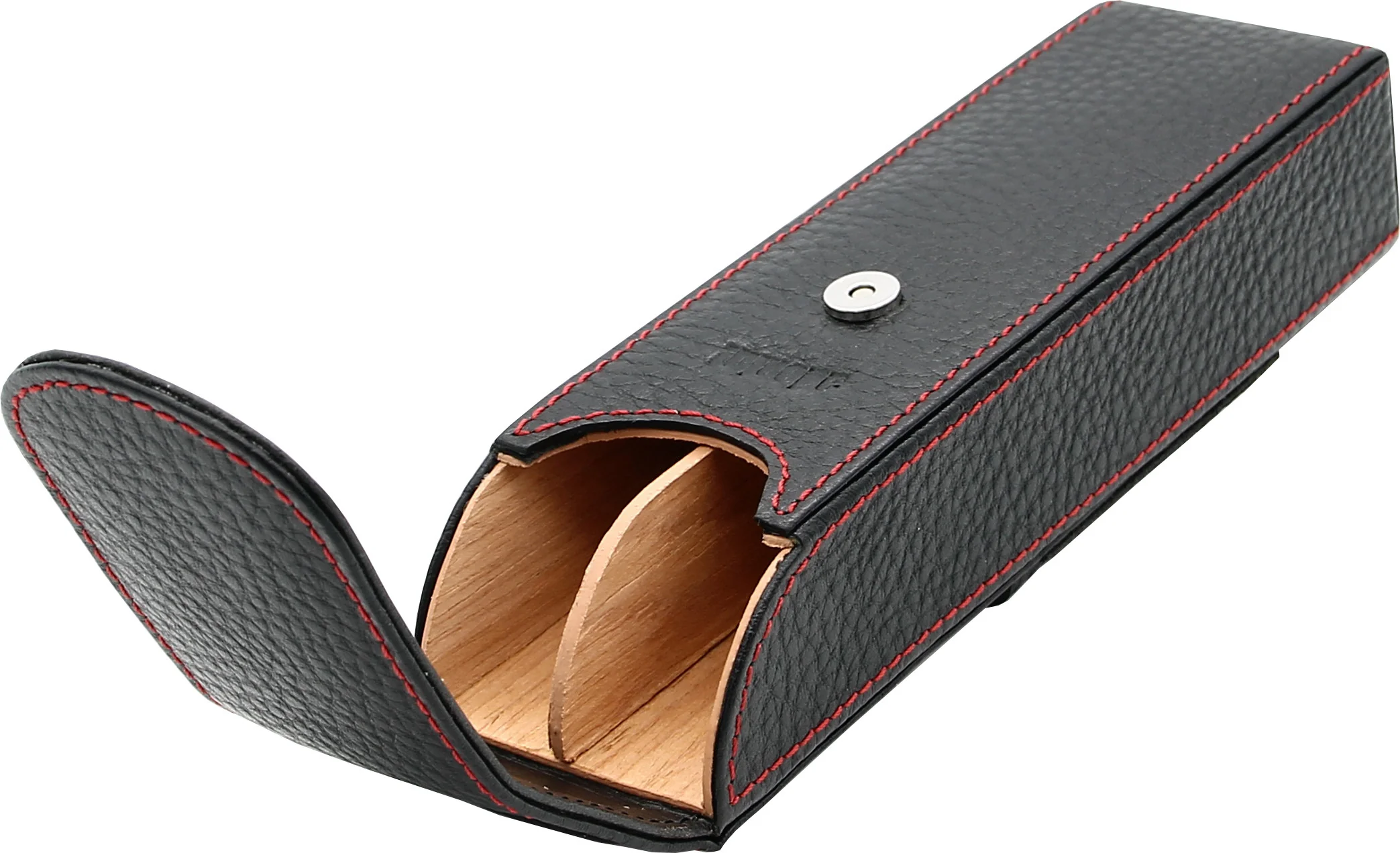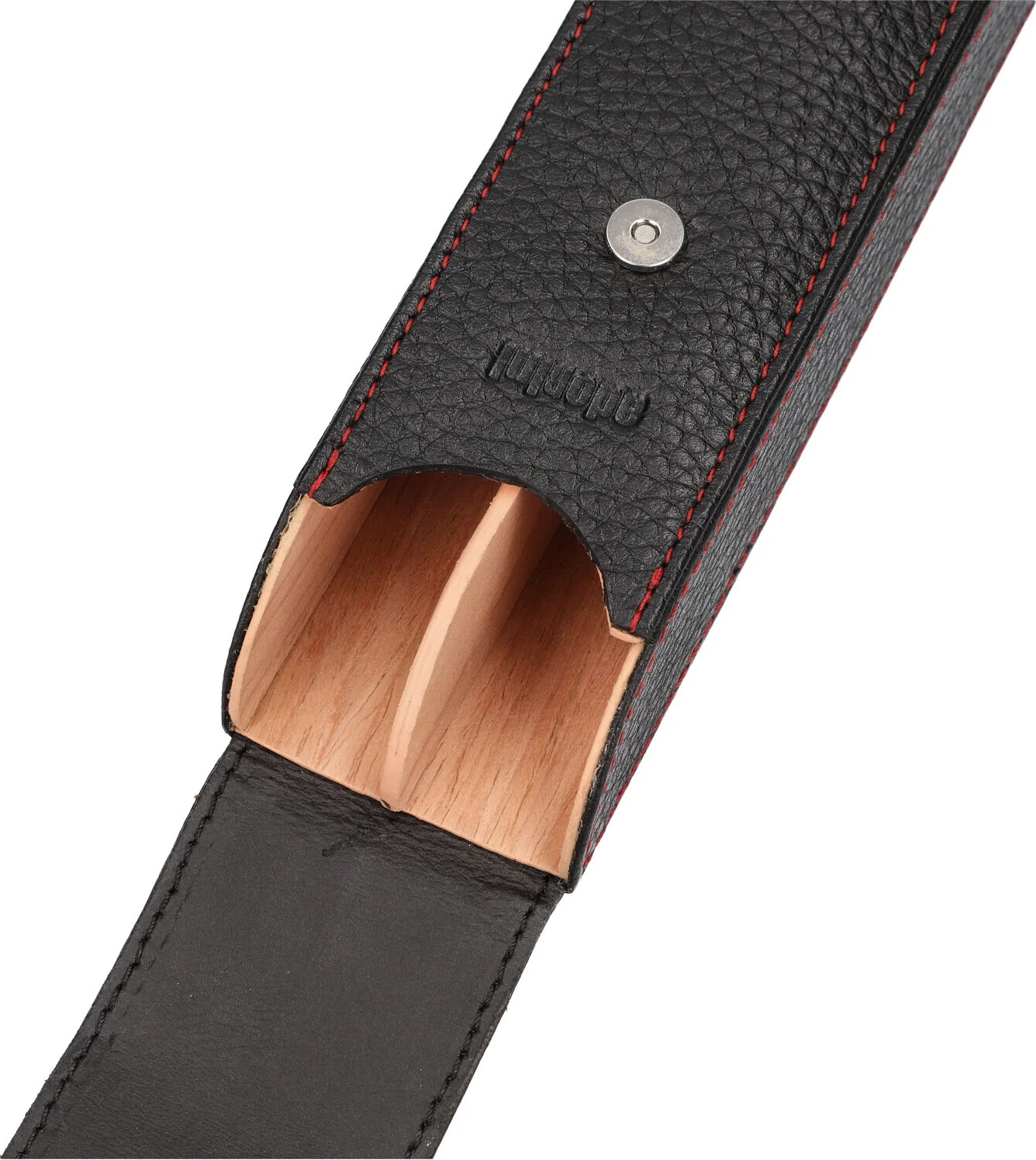 The case accommodates two cigars with a maximum length of 16 cm. A practical magnetic snap closure ensures a secure hold and gives the case a sophisticated look. A subtle adorini embossing is located under the opening lip, while the red decorative stitching creates a stylish contrast and harmoniously rounds off the appearance.