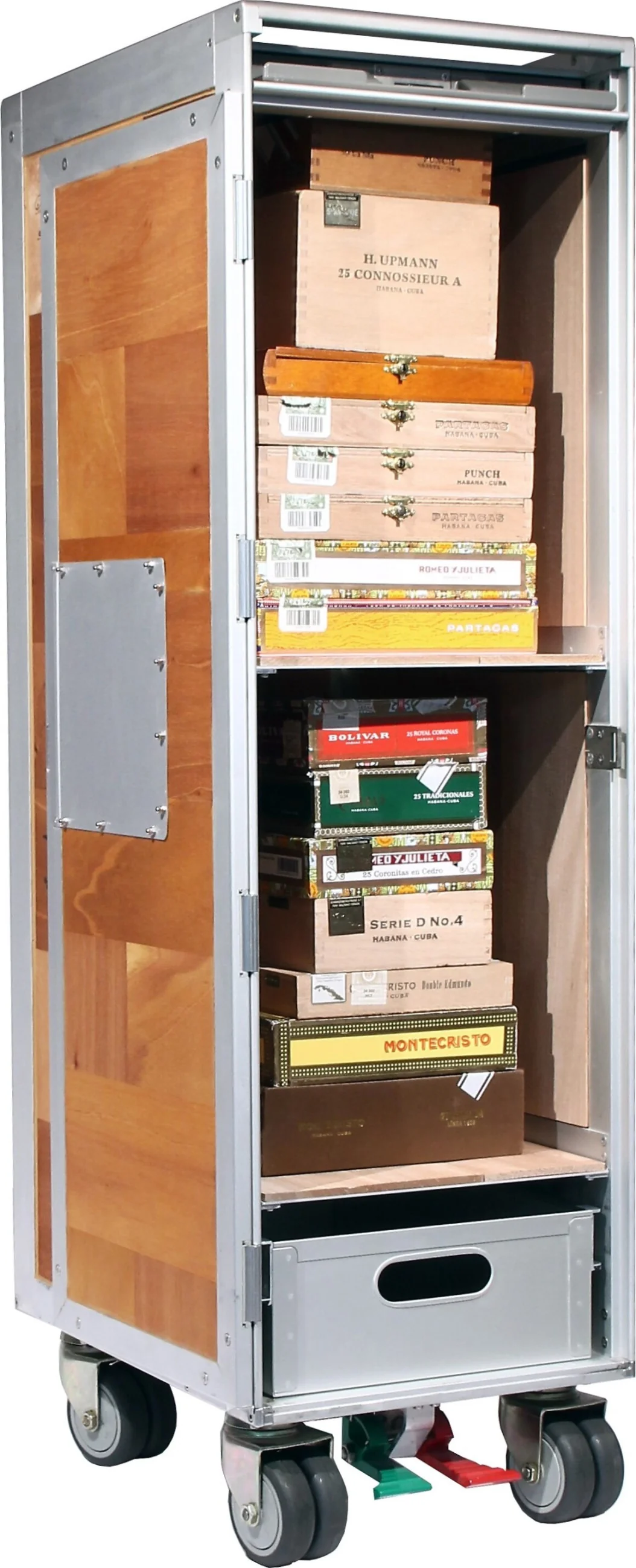 - Este carrinho é um carrinho original luxuoso (novo da empresa aérea, refinado exclusivamente na Alemanha pela adorini), folheado com folhas de cedro genuínas de caixas originais de Habanos e depois selado.
