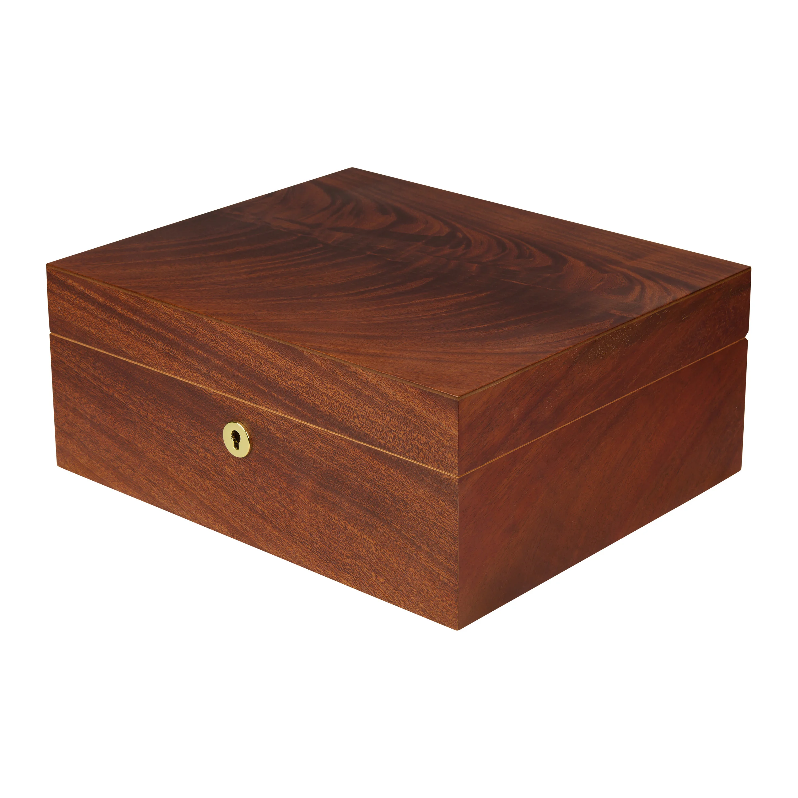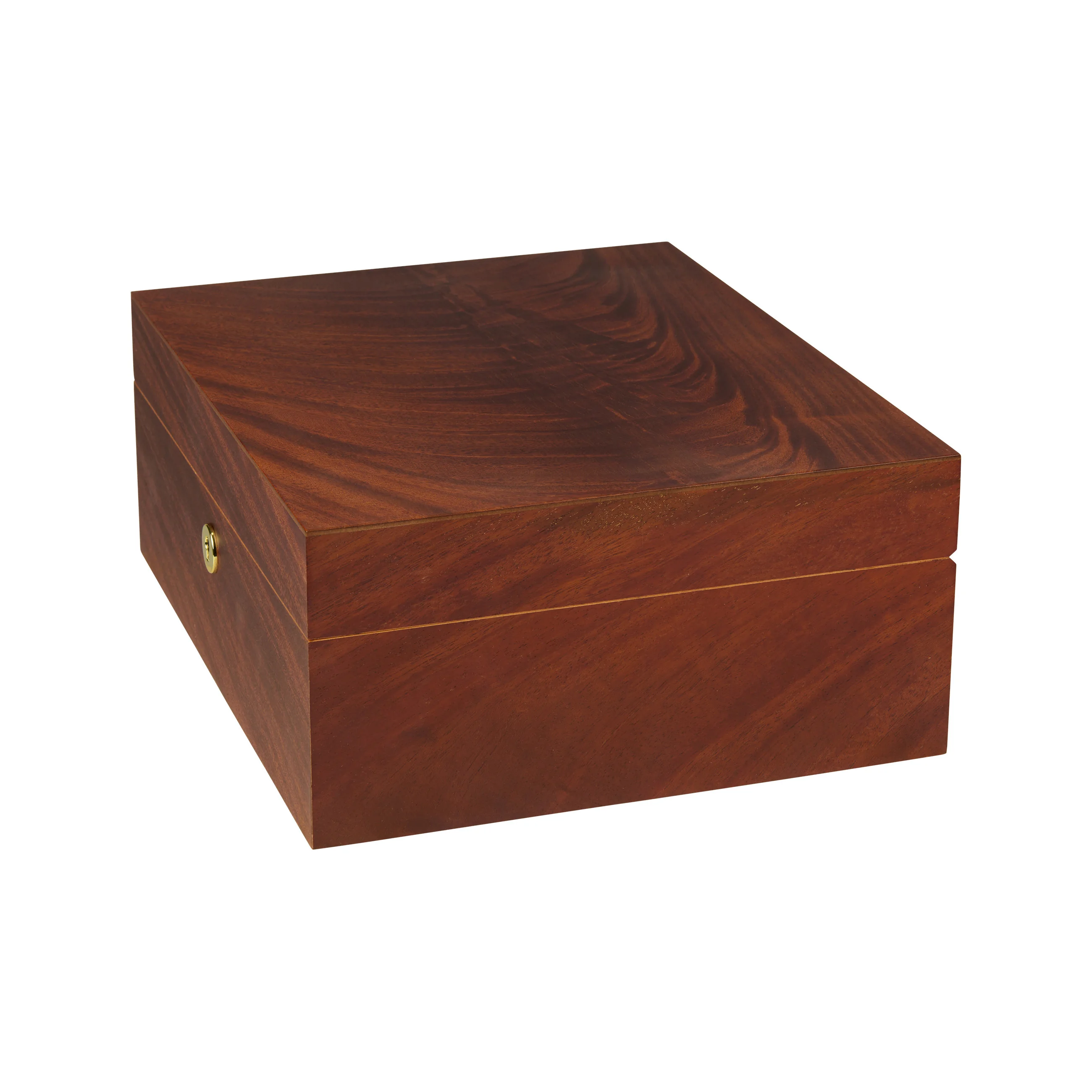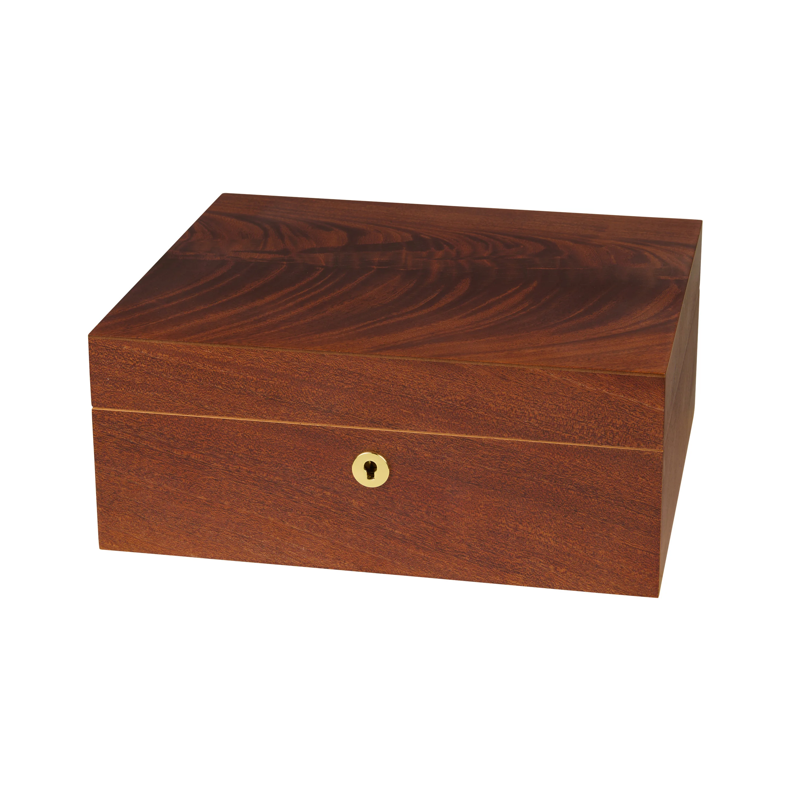 The mahogany wood impresses with its characteristic grain with reddish-brown to dark brown tones, interwoven with striking, flowing grain patterns that give the lid exceptional depth and dynamism. Thanks to its warm appearance, the humidor blends harmoniously into almost any setting. Medium-sized humidors hold up to 75 cigars, providing ample space for your cigar collection.