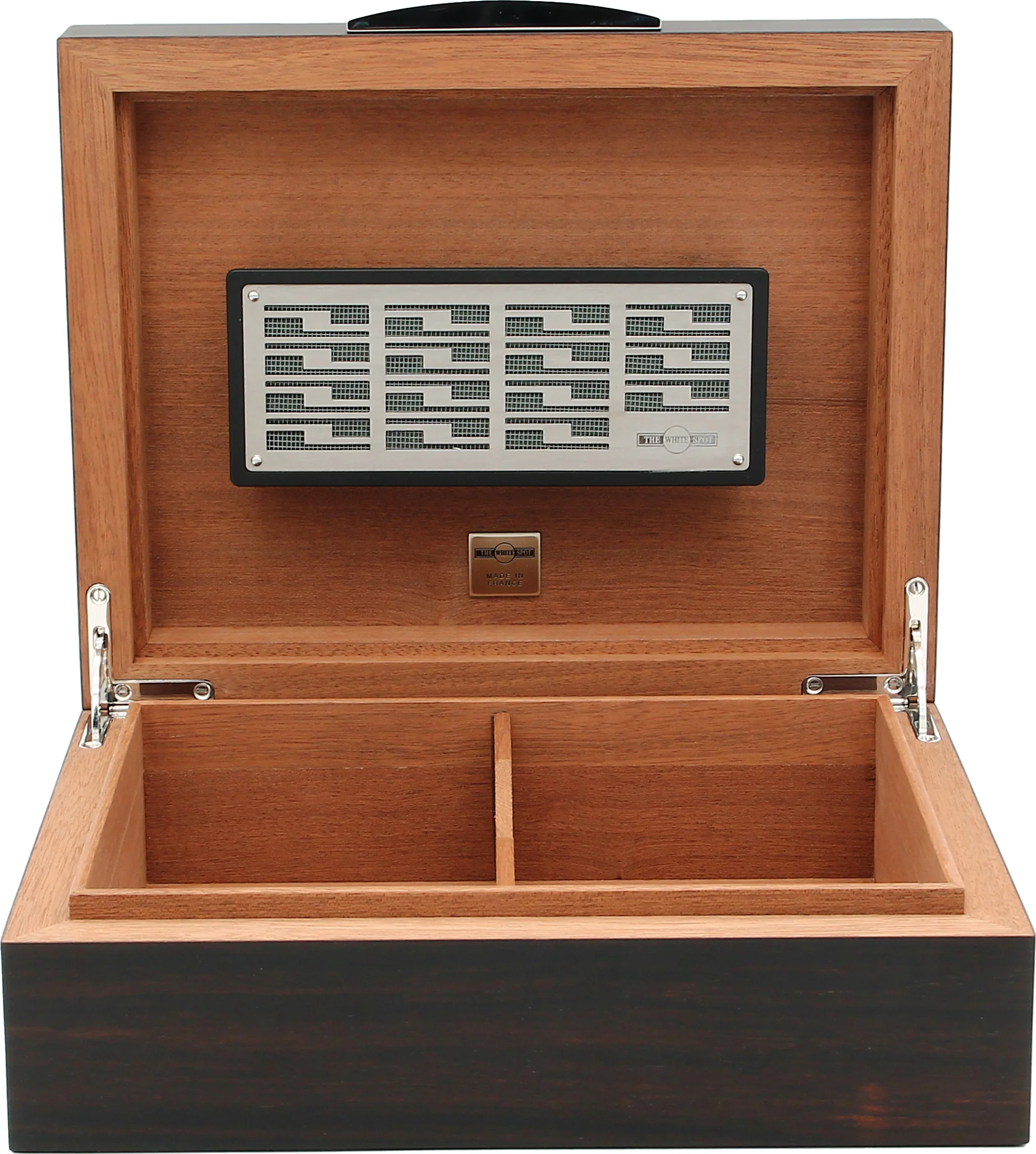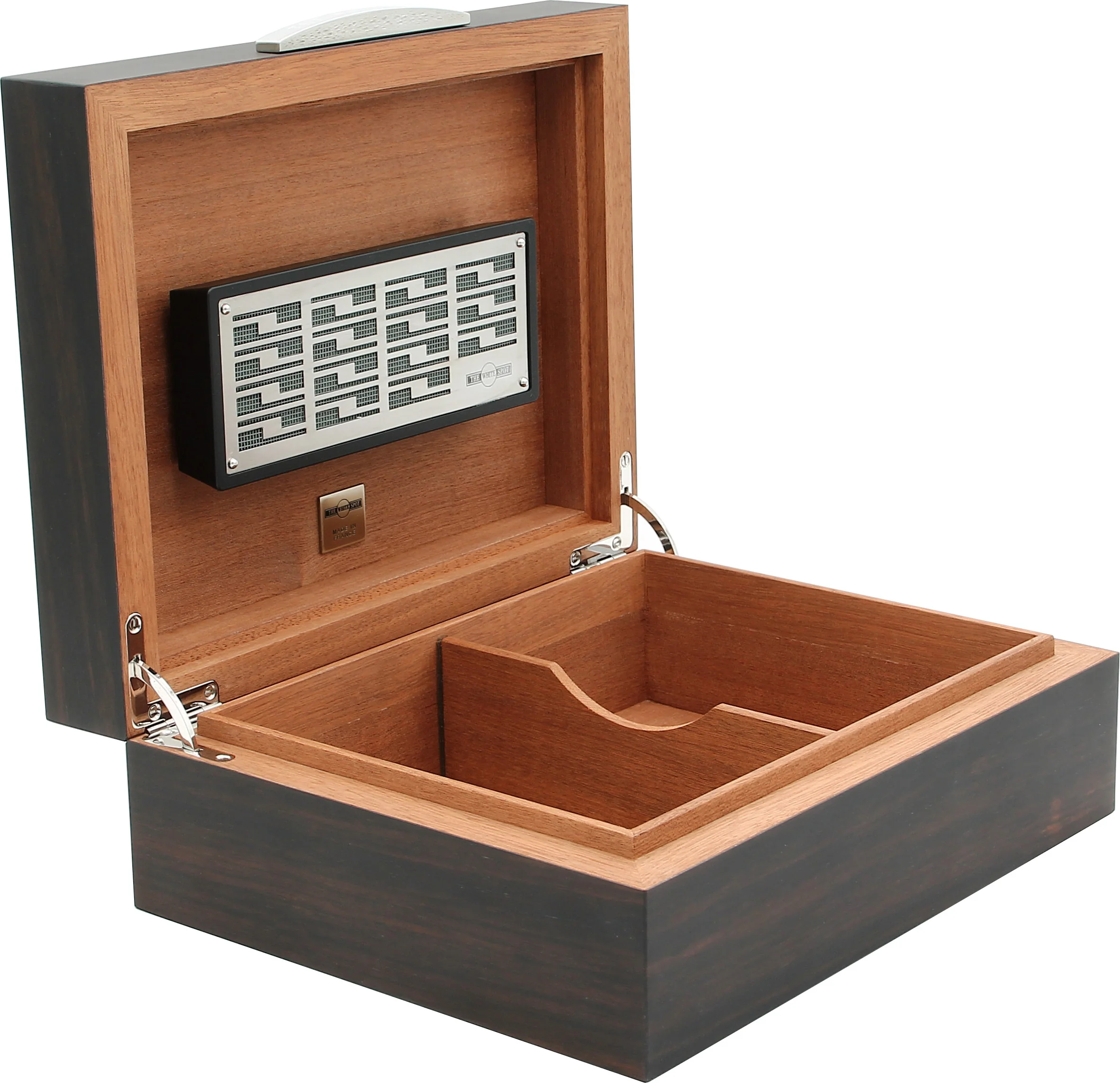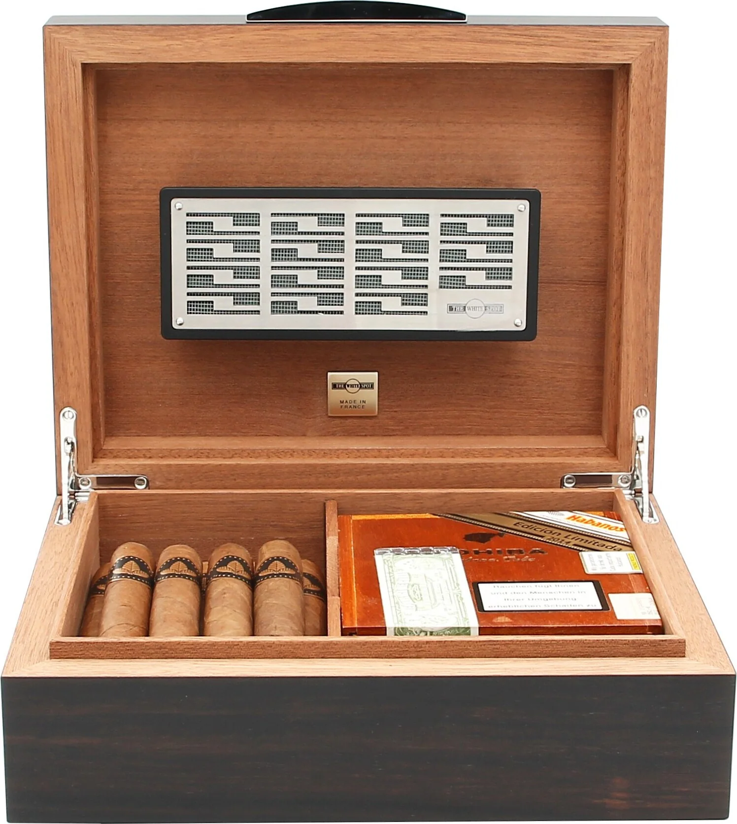With a capacity of approximately 50 cigars, it offers ample space for your collection or even smaller cigar boxes. The stylish handle made of shiny chrome, engraved with the White Spot logo and the famous white dot, underscores the aesthetically harmonious overall appearance and the exclusive brand identity. Even at first glance, it is clear that this is a high-quality brand product.