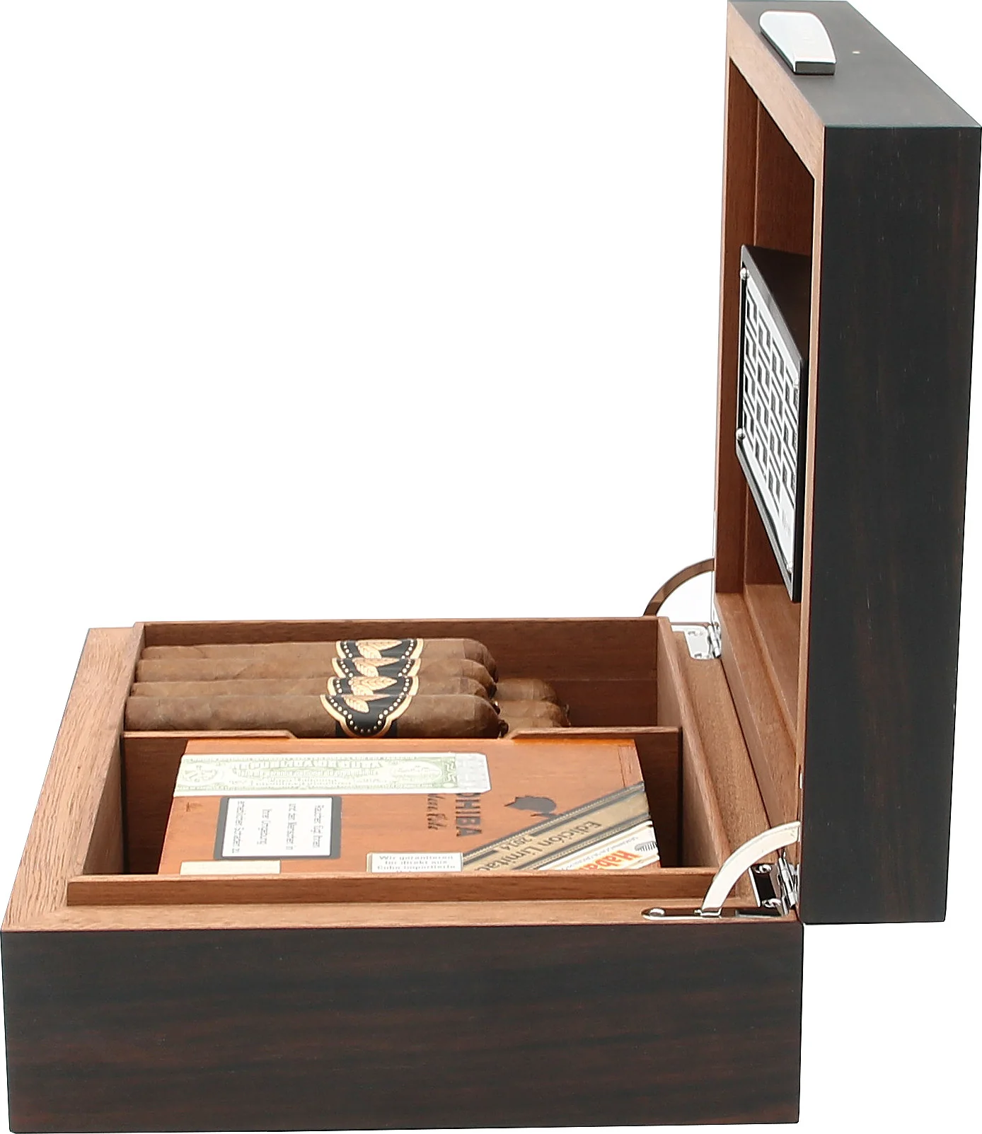 The scope of delivery includes a passive humidifier and a vertical divider for dividing the interior. The humidifier is attached magnetically to the designated metal plate in the lid.