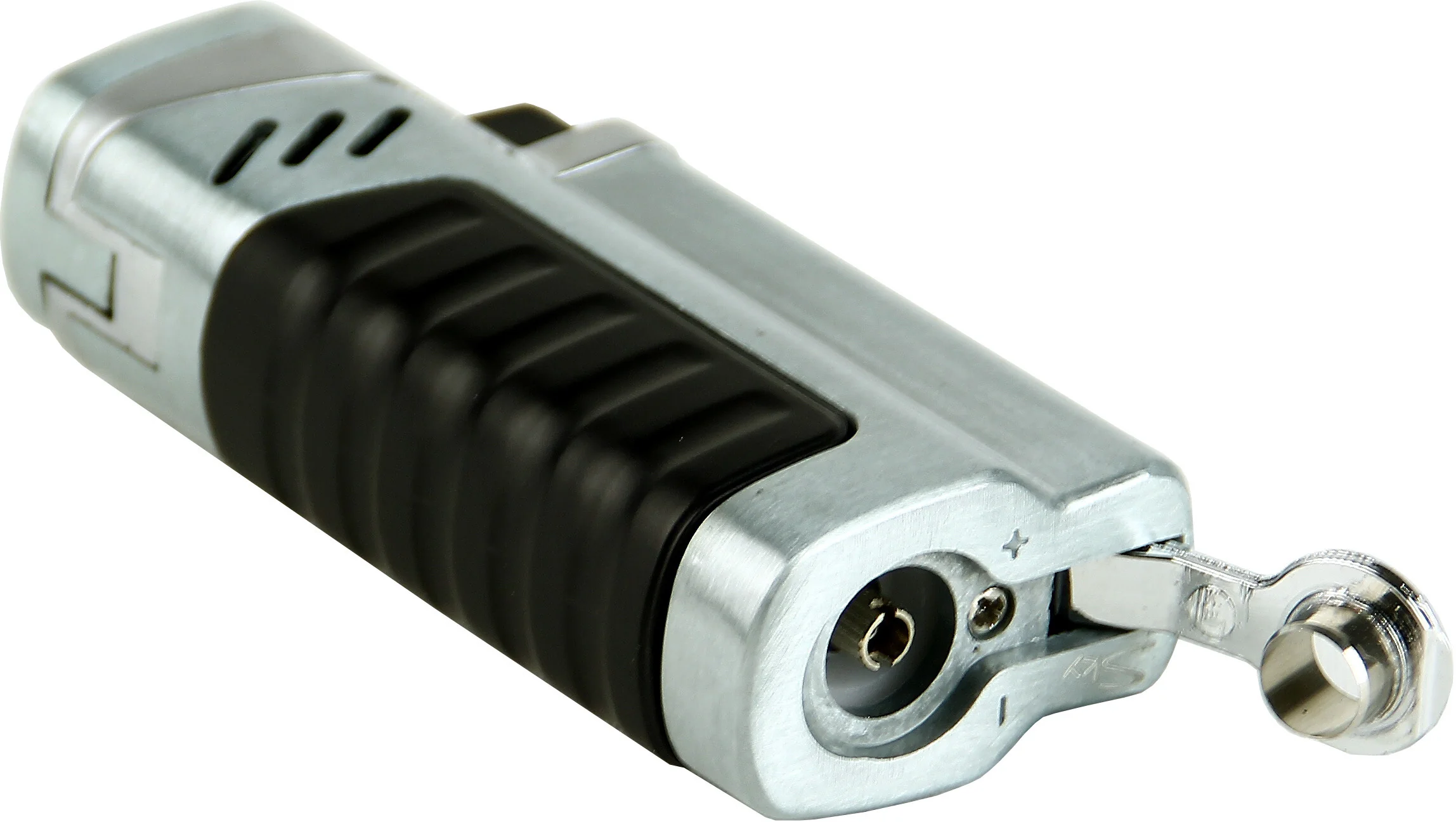 - Design cromado elegante: O isqueiro apresenta um corpo cromado elegante com elementos de empunhadura pretos, combinando estética com funcionalidade.