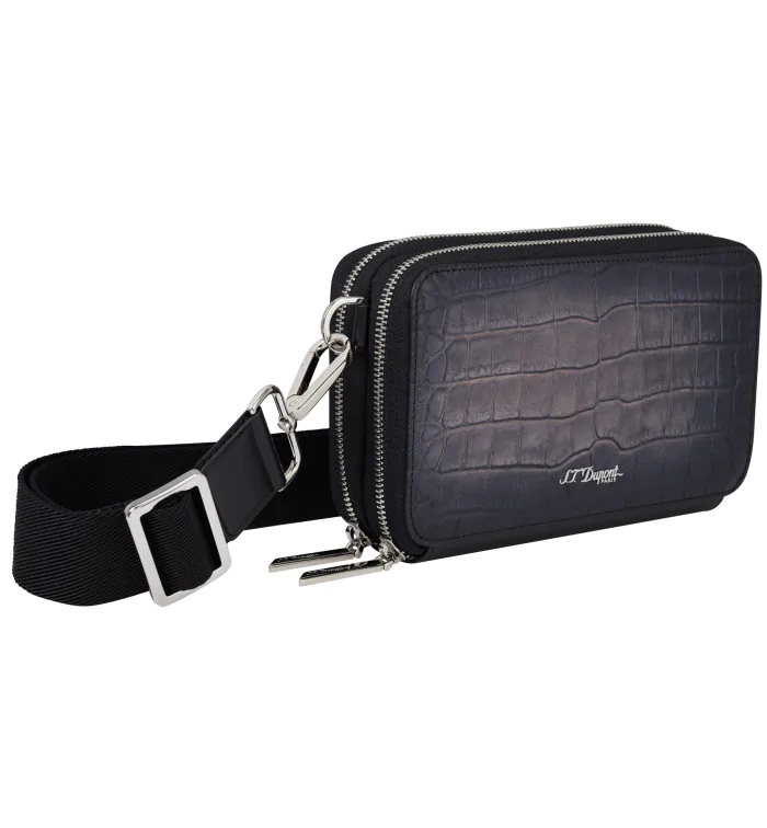 A bolsa transversal para charutos S.T. Dupont Le Grand Atelier preta é um acessório estiloso para fumantes de charutos. Feita de couro de bezerro com relevo de crocodilo, esta pequena bolsa de ombro oferece uma solução elegante e prática para transportar seus charutos e acessórios. A bolsa é ideal para carregar uma caixa de 3 charutos da S.T. Dupont junto com acessórios relacionados.