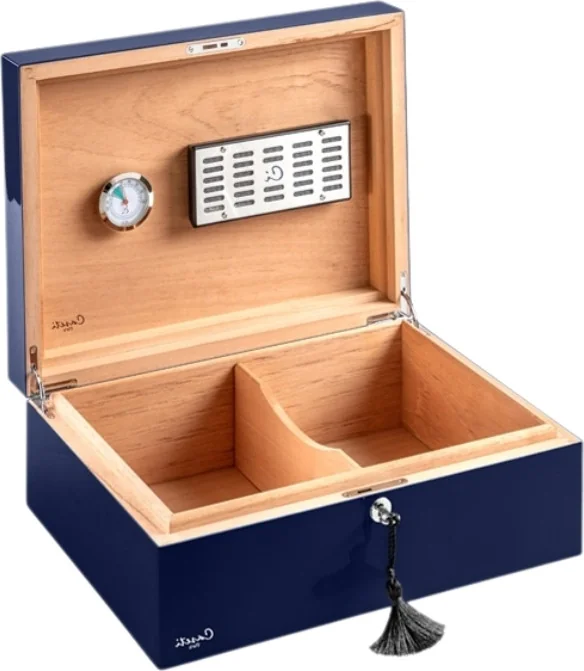 O corpo do umidor é feito de MDF e folheado com madeira de cedro na parte interna, o que contribui para o armazenamento e o envelhecimento ideais de seus charutos.