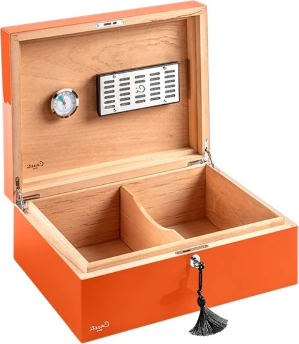 O Caseti Humidor Paris Orange é um umidor sofisticado da marca francesa Caseti que chama a atenção imediatamente com seu acabamento de alto brilho. A série Paris é sinônimo de cores vibrantes e se destaca claramente dos umidores clássicos, frequentemente vistos, de madeira folheada.