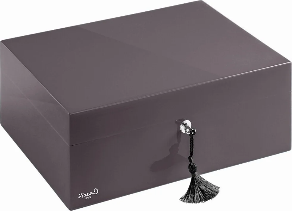 O acabamento é aplicado de forma particularmente espessa, dando ao umidor uma aparência de vidro - quase como se o corpo de madeira estivesse selado sob uma camada transparente de vidro. Um atrativo absoluto para todo amante de charutos com senso de estilo.