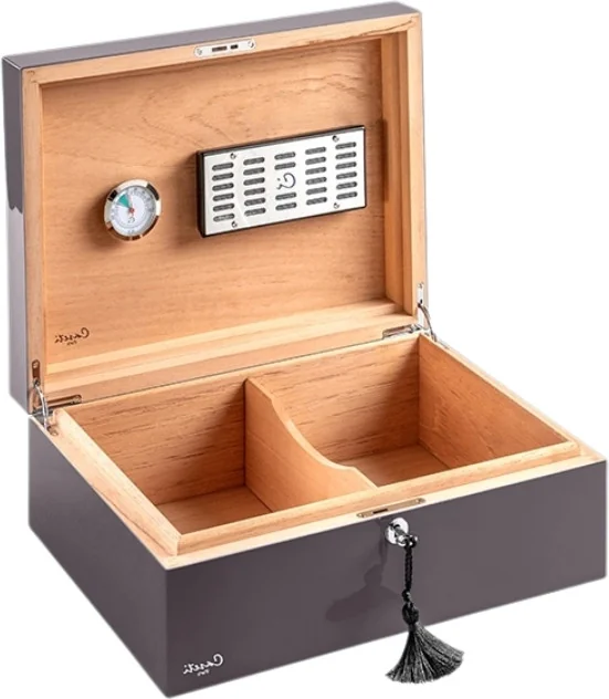 O corpo do umidor é feito de MDF e folheado com madeira de cedro na parte interna, o que contribui para o armazenamento e o envelhecimento ideais de seus charutos.