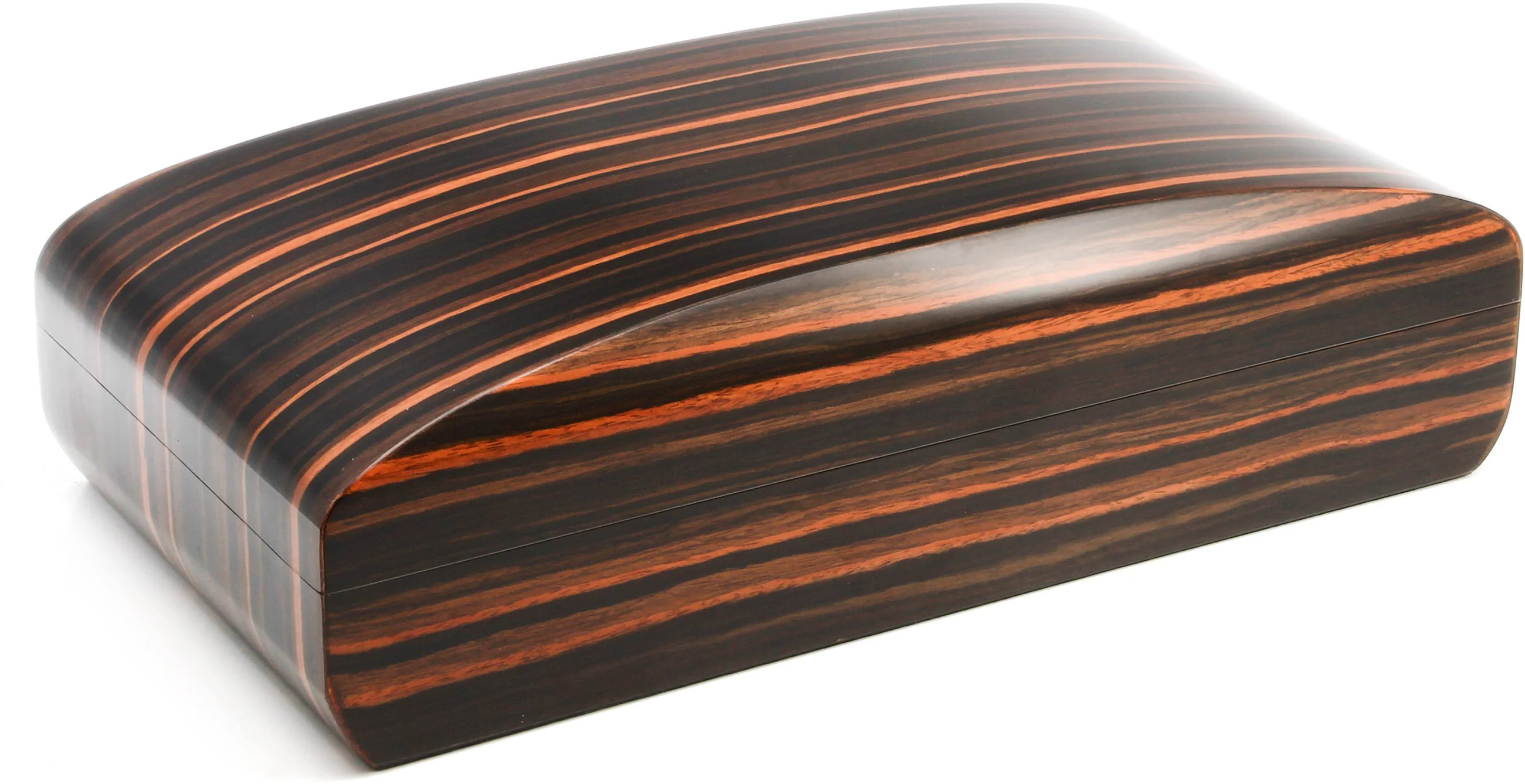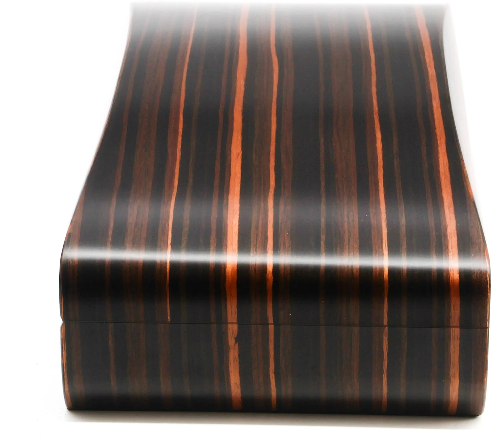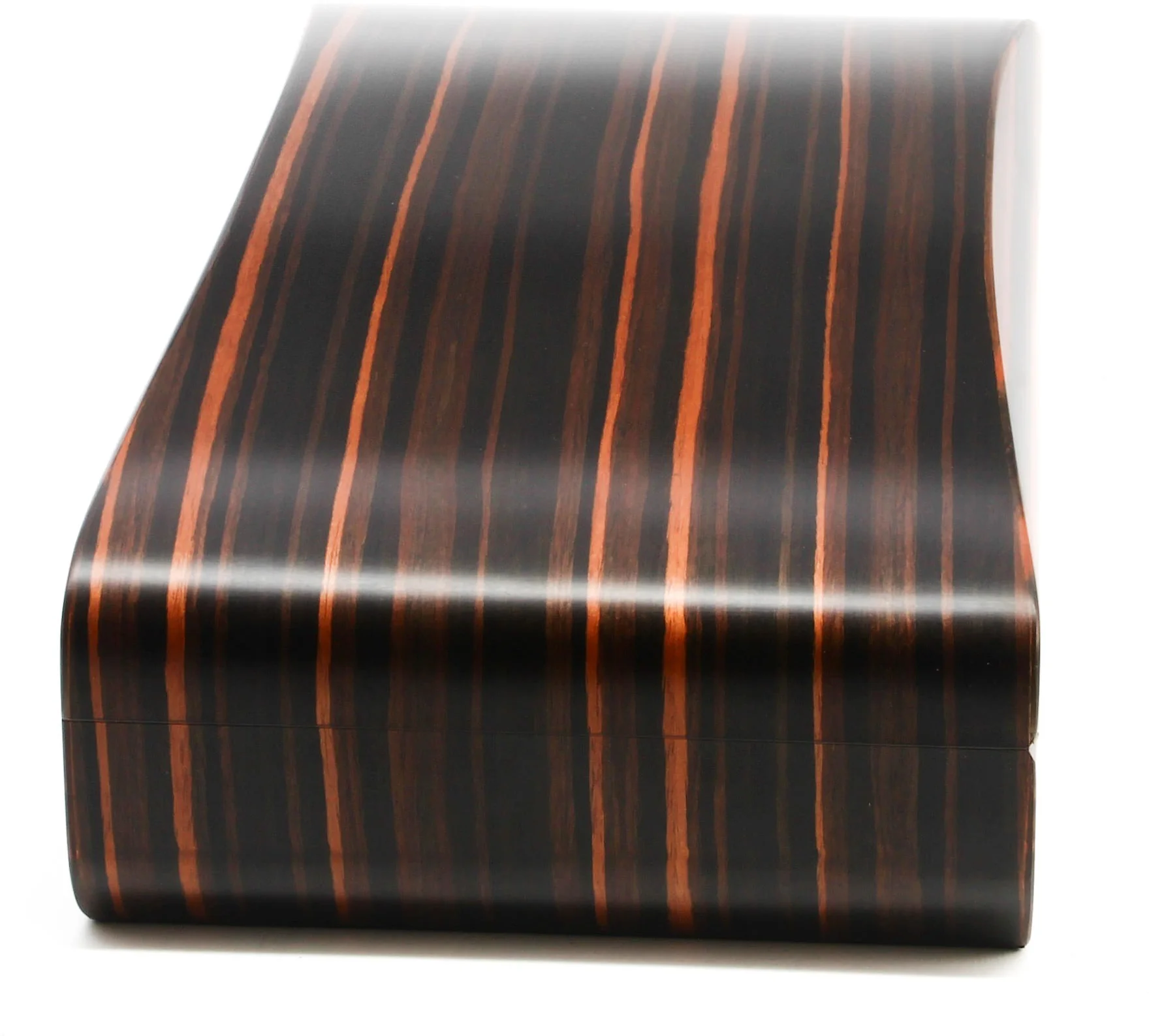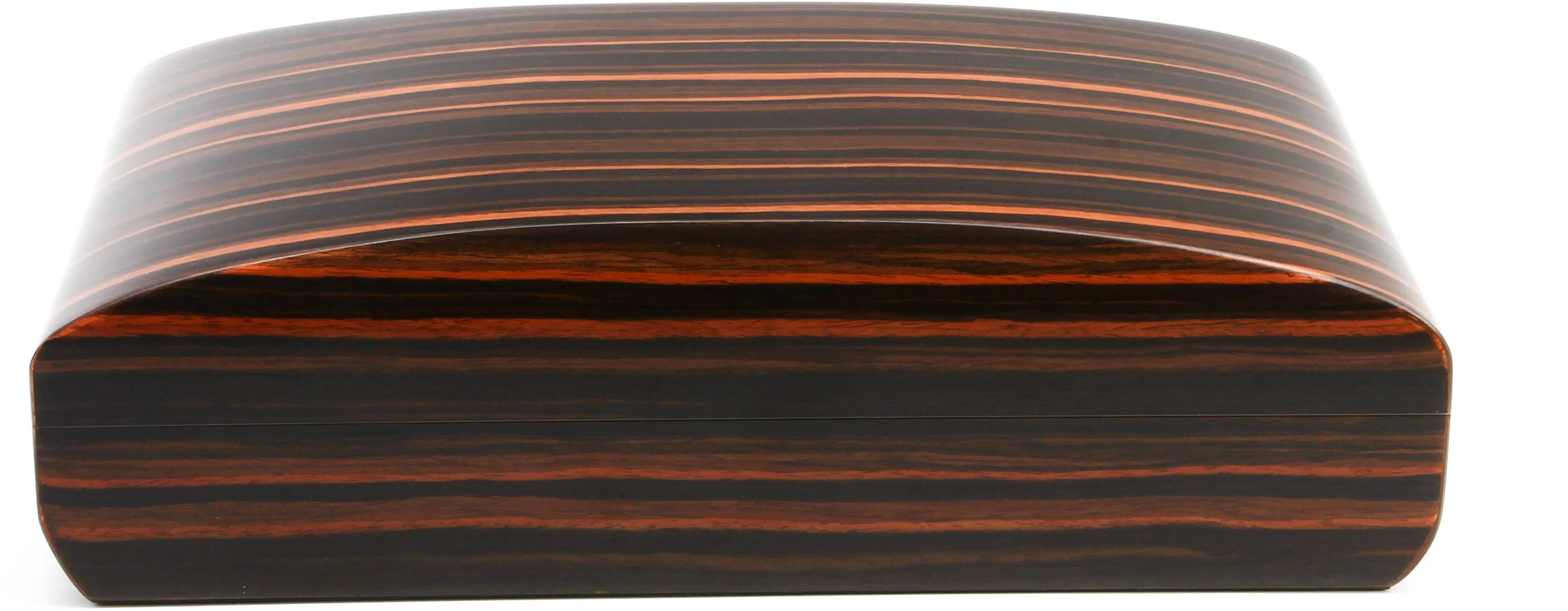 Com sua forma alongada e curvas sensuais, esta peça impressionante está muito longe do seu humidificador de passagem. O fascinante folheado de madeira de makassar excita com amplos traços de grãos de madeira claros e escuros, que fluem lindamente sobre a sofisticada forma oval do humidor.